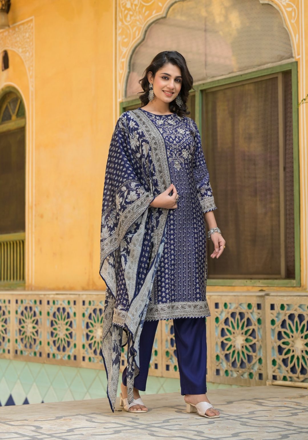 ZRI Navy Modal Printed Straight Suit Set – 2644