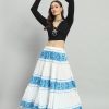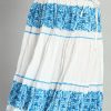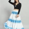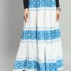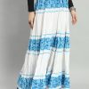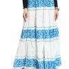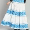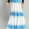 White & Blue Floral printed flared maxi skirt, has an elasticated waistband with drawstring closure, and a flared hem